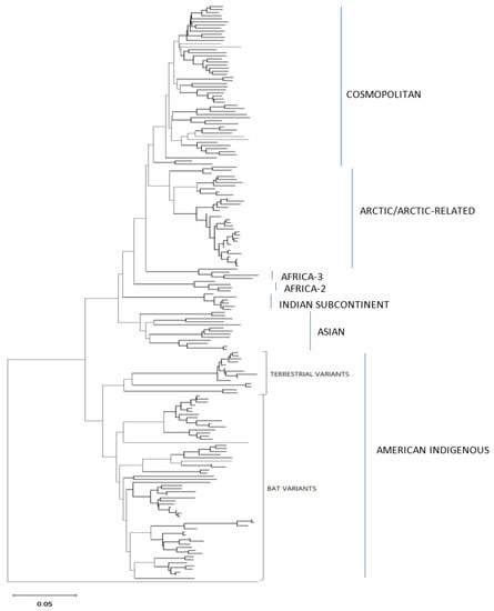 - Troupin, C.; Dacheux, L.; Tanguy, M.; Sabeta, C.; Blanc, H.; Bouchier, C.; Vignuzzi, M.; Duchene, S.; Holmes, E.C.; Bourhy, H. Large-scale phylogenomic analysis reveals the complex evolutionary history of rabies virus in multiple carnivore hosts. PLoS Pathog. 2016, 12, e1006041. [Google Scholar] [CrossRef] [PubMed]