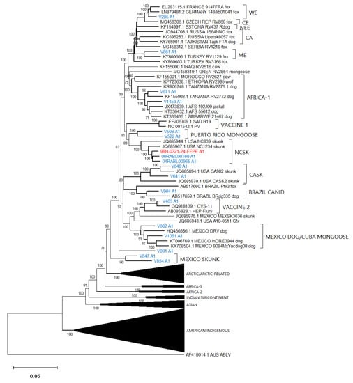 - Davis, R.; Nadin-Davis, S.A.; Moore, M.; Hanlon, C. Genetic characterization and phylogenetic analysis of skunk-associated rabies viruses in North America with special emphasis on the central plains. Virus Res. 2013, 174, 27–36. [Google Scholar] [CrossRef][Green Version]