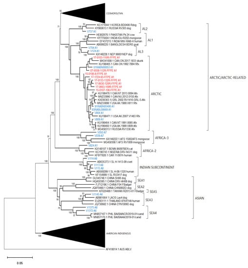 A Neighbor joining tree of 13 Ampliseq for Illumina samples and 39 RABVs representative of the Arctic lineage, as well as the Arctic-related outlier sample NEP99001 (AL3). The Ampliseq for Illumina samples were assembled using sample NT.1993.0669AFX (accession #MN233954) as a reference and then incorporated into the RABV whole genome alignment of the representative samples, details of which have been published [35,36]. The final dataset comprised 11,800 positions and was subject to phylogenetic analysis as described. Unfixed test samples are shown in blue and FFPE samples in red. Numbers at nodes indicate bootstrap values ≥70%. Clades are identified to the right of the tree.
