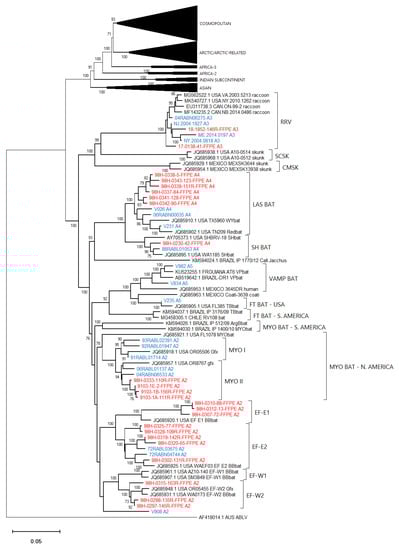 - Kuzmin, I.V.; Shi, M.; Orciari, L.A.; Yager, P.A.; Velasco-Villa, A.; Kuzmina, N.A.; Streicker, D.G.; Bergman, D.L.; Rupprecht, C.E. Molecular inferences suggest multiple host shifts of rabies viruses from bats to mesocarniovores in Arizona during 2001–2009. PLoS Pathog. 2012, 8, e1002786. [Google Scholar] [CrossRef] [PubMed]