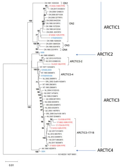 Given that genome coverage and phylogenetic placement was clearly significantly impacted by the nature of the sequence used for reference-guided assembly, we explored the potential to maximize genome coverage and thereby reveal finely resolved epidemiological relationships of samples processed by the Ampliseq for Illumina approach. This was achieved for the Arctic test samples which were compared to a reference collection of previously described sequences representative of this lineage which segregates into four sub-lineages Arctic1 to Arctic4 [35,36]. The Arctic1 sub-lineage circulates only in the Canadian province of Ontario where it has evolved into four geographically restricted variants, ON1 to ON4 [37]. The Arctic2 sub-lineage has historically circulated in several northern countries, but few samples have been extensively investigated while Arctic4 is limited in range to Alaska. The Arctic3 sub-lineage is widely dispersed across the northern hemisphere and is currently the dominant type across Canada and Greenland where 18 distinct variants were previously recorded [35]. The Ampliseq data for the five unfixed and the eight FFPE samples of the Arctic lineage included in this study were reassembled using an Arctic lineage sequence as a reference (NT.1993.0669AFX). This same sample was indeed included as an unfixed sample in the study (93RABL0669). For unfixed samples, this approach improved sequence fidelity but had minimal impact on genome coverage while for the FFPE samples a significant improvement in fidelity and genome coverage was observed. The resulting assemblies were aligned with a set of sequences of the Arctic lineage representative of all the major genetic variants reported in Canada and neighboring northern countries (Supplementary File S4) and this sequence set was used to generate an NJ tree (Figure 9).