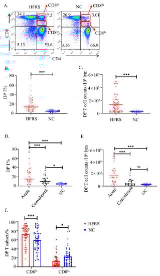 The kinetic changes of DP T cells in HFRS patients. (A). The representative flow cytometric plots of DP T cells in both HFRS patients and normal controls (NC). The gradually changing of the dots ‘colors indicated the cell density. The red color indicated the high cell density, while the blue color indicated the low cell density. Summary data of the comparison of the (B) percentage and (C) cell counts of DP T cells in HFRS patients and NC. Summary data of the comparison of the (D) percentage and (E) cell counts of DP T cells in different phases (acute phase and convalescent phase) of HFRS patients and NC. (F) The comparison of CD8hi and CD8lo subsets of DP T cells in HFRS patients and NC (For HFRS, n = 59; For NC, n = 36). * p < 0.05; *** p < 0.001.