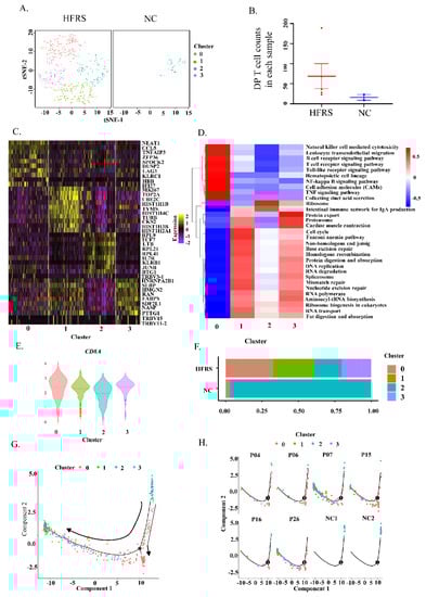 Identified DP T cells in HFRS patients by scRNA-seq. (A). t-SNE plot showing DP T cells from both HFRS and NC. (B) Dot plot showing the comparison of DP T cell counts in each sample of HFRS and NC. (C) The heatmap presenting gene expression profile of each cluster in DP T cells. (D) The KEGG heatmap displaying the pathway activation in each cluster of DP T cells. (E) The violin graph showing the comparison of CD8α gene expression in each cluster. (F) The bar graph presenting the cluster distribution in both HFRS and NC. (G) The pseudotime trajectory analysis of DP T cells. (H) The pseudotime trajectory analysis of DP T cells in each sample.