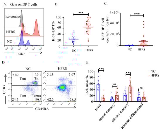 The activation status of DP T cells. (A). The expression of Ki67 in DP T cells was evaluated by flow cytometry. The representative histogram figures of Ki67 expression in DP T cells from both HFRS patients and NC, setting iso type staining as controls. (B) Comparison the percentage of Ki67+DP T cells and the (C) MFI of Ki67 in DP T cells from both HFRS patients and NC (For HFRS, n = 29, For NC, n = 18). (D) T cell subsets are defined as naïve (Tn) (CD45RA+, CCR7+), central memory (Tcm) (CD45RA−, CCR7+), effector memory (Tem) (CD45RA−, CCR7−), and terminal effectors (Temra) (CD45RA+, CCR7−). The representative dot blot figures showed the activation status of T cell subsets in DP T cells. (E) The statistical analysis showed the comparison of each T cell subset in both HFRS patients and NC (For HFRS, n = 13. For NC, n = 12). *** p < 0.001; “ns” means no significance.