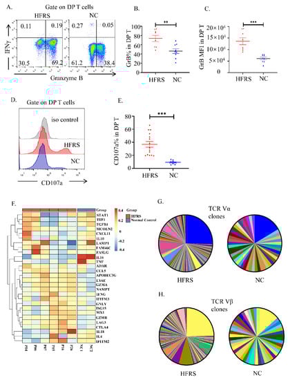The cytotoxic characteristics of DP T cells. (A). The representative flow cytometric plots showed the IFN-γ and granzyme B production of DP T cells. The gradually changing of the dots ‘colors indicated the cell density. The orange color indicated the high cell density, while the blue color indicated the low cell density. (B,C) The statistical analysis showed the comparison of (B) GrB% and (C) GrB MFI in both HFRS patients and NC (n = 9). (D) The representative histogram showed the expression of CD107a of DP T cells. (E) The comparison of CD107a% in both HFRS patients and NC (For HFRS, n = 15; For NC, n = 8). (F) The heatmap summarized the mediators’ production in DP T cells in each sample of scRNA-seq. (G,H) The pie chart presented the comparison of TCR repertoire analysis of TCR Vα (G) and TCR Vβ (H) in HFRS patients and NC. Each color represented a unique sequence of Vα or Vβ. ** p < 0.01; *** p < 0.001.