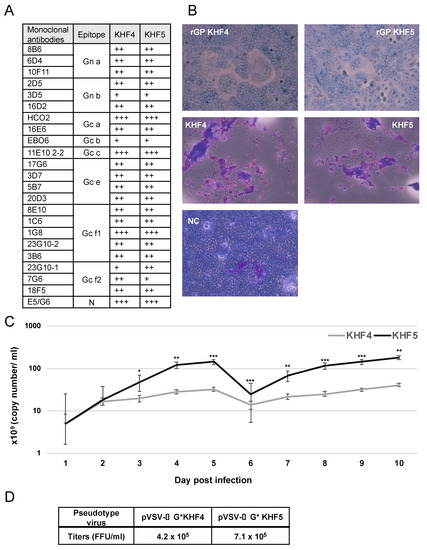 Virological characterization of KHF4 and KHF5. (A): GPs of KHF4 and KHF5 were compared for monoclonal antibody binding. The culture supernatants of hybridoma of monoclonal antibodies were diluted 1:1, 1:10, and 1:100, and positivity in the 1:100, 1:10, and 1:1 dilutions was assessed as +++, ++, and +, respectively. (B) Cell fusion assay. Cell fusion activity of recombinant glycoproteins of KHF4 and KHF5 expressed in Vero E6 cells by transfection (upper panels). Fusion activity of Vero E6 cells infected with KHF4 and KHF5 (central panels). Cells were inoculated with viruses at a MOI of 0.1 and incubated for 5 days. Uninfected Vero E6 cells were used as negative controls (NC; lower panel). (C) Viral growth in Vero E6 cells. Culture supernatant was collected from cells between 1 to 10 dpi, and the viral load was quantified by real-time RT-PCR (Significance was assigned as * p < 0.05, ** p < 0.01, and *** p < 0.001). (D) Pseudotype VSV with KHF4 and KHF5 glycoproteins were transfected to HEK293T cells and the propagated pseudotype VSV and titers were determined in Vero E6 cells.