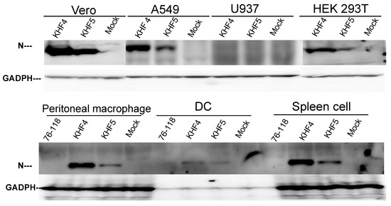 Cell tropism of KHF4 and KHF5 in vitro. Viral N protein production was compared by Western blotting to clarify virus replication in various cells. Four cell lines, (Vero E6, A549, U937, and HEK 293T) and peritoneal macrophages, dendritic cells (DC), and spleen cells obtained from five-week-old BALB/c mice were inoculated at a MOI of 0.1 and cultured for 5 days. GAPDH was used as the reference protein.