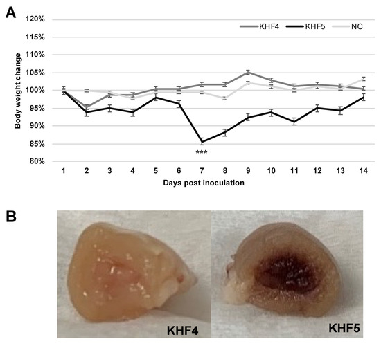 Body weight and renal changes in mice with KHF4 and KHF5 infection. (A) Five-week-old BALB/c mice were infected with KHF4 and KHF5 strains, or mock inoculation with culture medium of Veo E6 cells (NC). Subsequently the weight changes were measured between 1 and 14 dpi. *** p < 0.001. (B) At 7 dpi, a significant decrease in weight loss was observed, indicating renal hemorrhage.