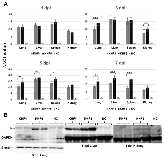 As reported previously, BALB/c mice infected with KHF5 showed weight loss at 5 dpi (Figure 3A) [21], and severe kidney hemorrhage occurred at 7 dpi (Figure 3B), from which the mice subsequently clinically recovered, based on symptoms such as ruffled fur and decreasing activity. As shown in Figure 4A, the viral RNA loads in the lung, liver, spleen, and kidney were determined at 1,3, 5, and 7 dpi using real-time RT-PCR. The viral RNA load in the lung and kidneys was significantly higher in KHF5 than in KHF4-inoculated mice at 3 dpi. In the lungs, high levels of viral N protein were detected in mice with KHF5 infection alone (Figure 4B). The results suggest that the lungs are an important site for viral replication during the early phase of infection in mice. A high viral load in the liver was detected in both the KHF4 and KHF5-inoculated mice. Significantly higher viral loads were observed in KHF5-inoculated mice at 5 and 7 dpi. Viral N protein was detected in the liver, and the ratio of protein was almost the same as that in the lung when compared with the reference protein GAPDH in KHF5-infected mice (Supplementary Table S1). Conversely, in KHF4-infected mice, N protein production in lungs was lower than in KHF5-infected mice. The results suggest that the lungs are an important site for viral replication of KHF5. Viral N protein in spleens were below detectable levels.