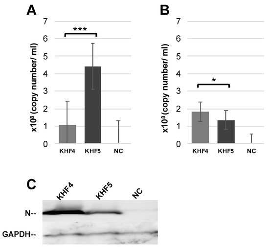 KHF4 and KHF5 replication in lung tissue. (A) Lungs were collected from KHFV-infected mice at 5 dpi and cultured. After 7 days, the supernatant was collected for real-time RT-PCR. (B) Uninfected BALB/c mouse lungs were collected and cultured as described above. After infection with KHFV, the supernatant was collected at 7 dpi for real-time RT-PCR analysis. (C) Viral N protein in the lung tissue as shown in Figure 5B detected by Western blot. Results from mock inoculated mouse and lung tissue are shown in NC (Significance was assigned as * p < 0.05, and *** p < 0.001).