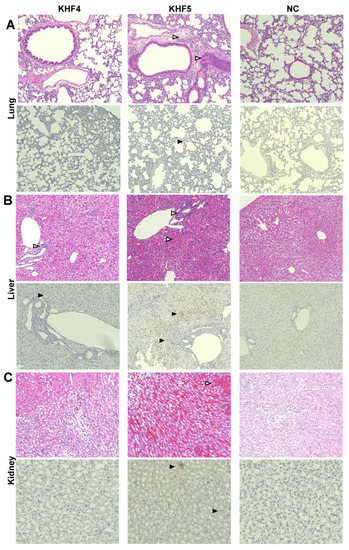 Immunohistochemistry analysis of tissues from KHF4 and KHF5-infected mice. Tissue slices were stained with hematoxylin and eosin (HE), and viral antigens were detected using a biotinylated E5G6 monoclonal antibody with the Vector M.O.M immunodetection kit. Characteristic lesions were indicated by open triangles. Viral antigens are indicated by closed triangles. (A) Peri bronchus edema with lymphocyte aggregation was observed in KHF5-infected lungs, and mild antigen reaction was observed in KHF5-infected alveolar epithelial cells. (B) Petechial hemorrhage was observed in KHF5-infected livers by HE staining, whereas KHF5-infected livers showed multiple antigenic reactions and hemorrhage. The KHF4-infected liver also showed perivascular lymphoid infiltration. (C) Renal hemorrhage caused by KHF5 infection was distributed in the cortex-medullary region, and antigens were detected in the tubular regions.
