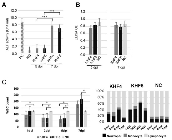 Acute hepatitis with lymphocytic infiltration of immune cells was observed in the KHF4 and KHF5 sections; therefore, liver dysfunction was assessed via ALT activity analysis. As shown in Figure 7A, serum ALT activity was significantly increased in both KHF4 and KHF5-infected mice at 7 dpi. In contrast, BUN levels did not change at 5 dpi and 7 dpi despite renal hemorrhage (Figure 7B). We collected blood from each mouse at 1, 3, 5, and 7 dpi to examine white blood cell population levels, which showed a decrease in white cell numbers at 5 dpi, and an extreme increase at 7 dpi. At 5 dpi, KHF5-infected mice showed a high ratio of neutrophils, indicating that neutrophilia may be related to pathogenesis in this phase (Figure 7C). Serum IL-6 and TNF-α were examined but both of them were not detected (Supplementary Figure S2). To analyze renal damage, we examined renal proteins by SDS-PAGE (Supplementary Figure S3). Compared to urine from control mice, multiple bands were evident in the urine of infected mice, indicating that functional changes may have occurred. However, albuminuria was not detected. Notably, 120 KDa bands were observed in KHF5-inoculated mice at 7 dpi, though the protein sequences could not be identified (data not shown). Urine kidney injury molecule (KIM-1) levels were also examined using a KIM-1 detection kit, but no increase in KIM-1 levels was detected (data not shown).