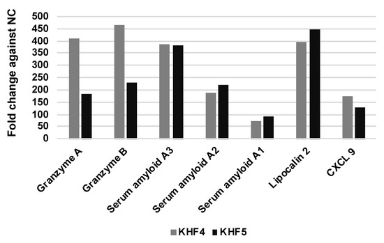 Liver gene expression profiling using microarrays. Transcriptional changes were compared in KHF4, KHF5, and mock-infected mice. The top ten genes showing the maximum fold-change difference in KHF4/KHF5-infected mice relative to the controls were selected and compared.
