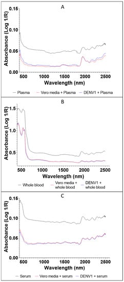 Average NIR unprocessed spectra of plasma (A), whole blood (B), and serum (C) alone, combined with Vero media or DENV1. Spectra of all concentrations/donor tested were averaged into a single spectrum for all samples. In total, 1100, 600 and 760 NIR spectra for plasma, whole blood, and serum samples, respectively, were collected.