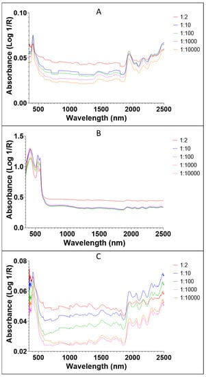NIR spectra of all DENV1-infected samples split by concentration for plasma (A), whole blood (B) and serum (C). Each spectrum is an average of all spectra collected from multiple donors for the dilution shown. Initial concentration of DENV1 was 3.16 × 104 infectious unit/µL.