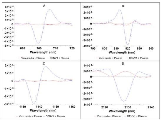 To investigate prominent peaks of DENV1 in plasma, we plotted the 2nd derivative spectra (Figure 4). We have presented results for a wider wavelength than what was analysed to determine repeated overtones. The second derivative graph shows distinct peaks for DENV1 in plasma relative to Vero media in plasma at 700, 706, 812, 819, 1130, 1137, 1142 and 2127 nm (Figure 3A–D). For whole blood and serum samples, no significant peaks could be found that were attributed to DENV1 infection. Table 4 shows the prominent absorption peaks identified from DENV1-infected samples. Peaks at 812 and 819 represent the 3rd overtone of C-H []. Peaks at 1130, 1137 and 1142 nm represent the 2nd overtone of C-H vibration and are indicative of the presence of methyl/methylene/oil []. A peak at 2127 nm represents C-H vibration and is indicative of the presence of saturated fatty acids [].