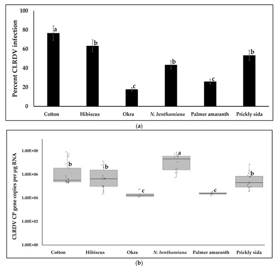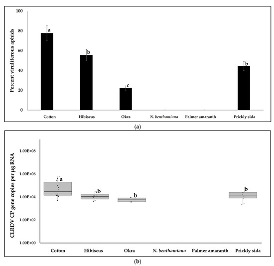 3.2. CLRDV Acquisition by Aphids from Cotton and Alternate Hosts and Virus Quantitation