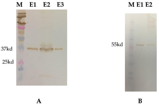 Western blot confirmation of affinity purified proteins. (A) Purified G6 RVC VP7 (37 kd), (B) Purified P[5] VP4* (55 kd), M—Protein marker, E1, E2 and E3—protein elutes.