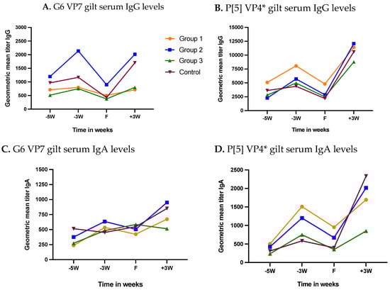 GMT IgA levels at 5 WPF were G6 (GMT 237.44–514.67) and P[5] (GMT 236.77–503.97) (Figure 3C,D). Gilt serum IgA levels for both proteins in treatment groups increased at 3 WPF after respective NPE doses. Control group gilt serum IgA levels for G6 decreased at 3 WPF and showed a slight increase for P[5] at 3 WPF (Figure 3C,D). Similar to IgG levels, IgA levels also increased sharply post-farrow until weaning.