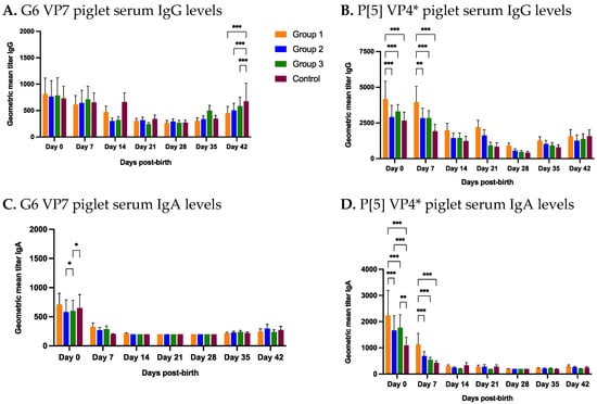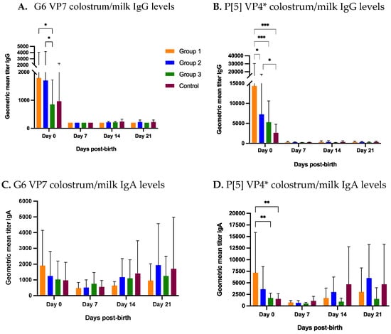 At day 0, G6 IgA levels were numerically higher compared to other groups (Figure 4C). In contrast, colostrum P[5] IgA titers were significantly higher for group 1 compared to group 3 and control group and numerically higher than group 2 (Figure 4D). Overall, IgA titers declined at day 7 and then gradually increased until weaning (Figure 4C,D). Group 2, 3 and control IgA titers for both proteins at weaning matched or exceeded their titers in colostrum at day 0. However, treatment group 1 IgA titers for both antigens did not reach the colostrum IgA levels at day 0 (Figure 4C,D). The IgG and IgA VP4* (P[5]) titers were manifold higher than IgG and IgA VP7 (G6) titers (Figure 4A–D).