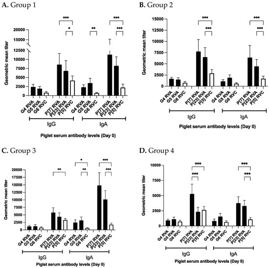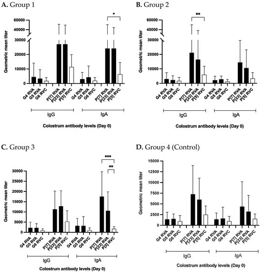 Groupwise comparison of antibody levels against RVA and RVC in day 0 piglet serum samples. Vertical axis represents geometric mean antibody titers for respective study groups. Horizontal axis represent IgG and IgA levels against RVA and RVC genotypes. Black shaded bars represent different RVA genotypes and white colored bars represent RVC genotypes. (A) RVA and RVC antibody levels in group 1, (B) RVA and RVC antibody levels in group 2, (C) RVA and RVC antibody levels in group 3, and (D) RVA and RVC antibody levels in group 4 (Control group). Significance levels (p-values) only describing comparison between RVA and RVC genotypes are illustrated (* p < 0.3; ** p < 0.002; *** p < 0.001).