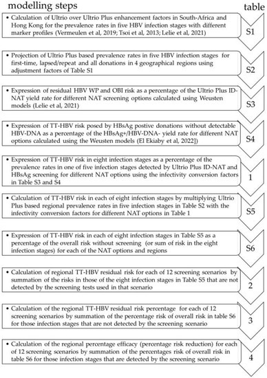Subsequent modelling steps to estimate the efficacy of different testing scenarios in removing TT-HBV risk using screening data from four geographical regions. Each of the modelling steps is documented with a table in this report (i.e., Supplementary Tables S1–S6 and Table 1, Table 2, Table 3 and Table 4) [7,8,9,11].