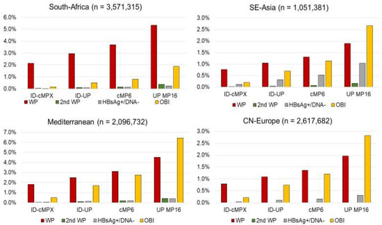 Figure 4 and Supplementary Table S6 also show that the relative pre-NAT WP risk was always higher than the OBI risk in ID-NAT and MP6-NAT screening setting, but that this turned around with the least sensitive MP-NAT protocol (Ultrio Plus in MP16 configuration) in three of the four regions.