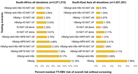 For example, without any HBV screening in South Africa, a transmission risk of 7888 HBV infections/million first-time donations was estimated, which diminished to 193/million in previously screened lapsed plus repeat donations. HBsAg screening reduced risk to 421/million in first-time and to 91/million in lapsed plus repeat donations. Adding Ultrio Plus ID-NAT reduced risk to 111/million in first-time and to 28/million in lapsed plus repeat donations. When all South African donations are considered together, the risk reduced from 962/million without screening to 35/million with Ultrio Plus ID-NAT alone, lower than that achieved by HBsAg and anti-HBc in combination with Ultrio Plus MP16-NAT (51/million). A similar pattern was found for the more sensitive cobas MPX HBV-NAT assay that reached a lower residual risk by itself in ID-NAT format (23/million) than when it was applied in MP6-NAT format in combination with HBsAg and anti-HBc (36/million).