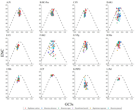 Effective number of codons analysis (ENC)-plot analysis of the individual protein (A–K) and complete polyprotein (L) coding sequences of turnip mosaic virus, with ENC against the GC3s of different hosts. The black dotted line represents the standard curve when the codon usage bias is determined by only the GC3s composition. The Raphanus sativus, Brassica oleracea, Brassica rapa, Sisymbrium loeseli, Rapistrum rugosum and Brassica juncea hosts are represented in red, blue, green, purple, orange, wathet blue and brown, respectively.