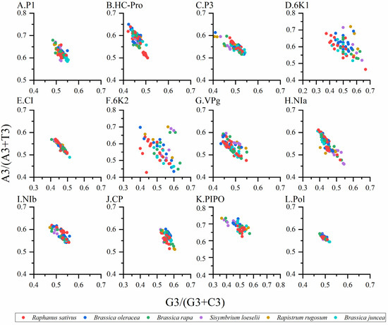 Parity plot showing the presence of AT bias [A3%/(A3% + T3%)] and GC bias [G3%/(G3% + C3%)] for the individual protein (A–K) and complete polyprotein (L) coding sequences of turnip mosaic virus. The center of the plot, where the value of both the coordinates is 0.5, indicates the place where there is no bias in the mutation or selection rates. The Raphanus sativus, Brassica oleracea, Brassica rapa, Sisymbrium loeseli, Rapistrum rugosum and Brassica juncea hosts are represented in red, blue, green, purple, orange, wathet blue and brown, respectively.