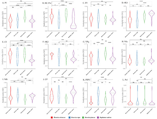 The similarity index (SiD) analysis of the individual protein (A–K) and complete polyprotein (L) coding sequences of turnip mosaic virus in relation to the natural hosts. One-way ANOVA and Tukey’s test were employed to compare the mean of the SiD values pertaining to the different hosts. Asterisk indicated the differential SiD value of turnip mosaic virus between four hosts is statistically significant or very significant (p < 0.001 or p < 0.0001), “ns”, not significant, p > 0.05. * p < 0.05; ** p < 0.01, *** p < 0.001; **** p < 0.0001.