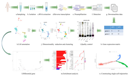 The acquisition and analysis of single cell data. The first row depicts the entire data collecting process (a–g). The second and third lines represent the procedure of downstream analysis. After build the gene expression matrix (h), quality control is carried out according to the proportion of mitochondrial genes (each point represents one cell) (i). The cells whose mitochondrial genes account for more than 10% are generally filtered. Subsequently, dimension reduction and clustering are carried out. The single cell data are projected onto two-dimensional plane (each point represents a cell). The dots with different colors on the left represent different samples, and the dots on the right represent different cell clusters after algorithm clustering (j). Then, the Singler package is used to annotate the cell clusters, and each color represents one cell type (k). The volcano map is a widely accepted method to visualize the differential expressed genes. Each dot represents one gene, and the dotted lines represent thresholds set artificially (l). The enrichment of the differential genes into the pathway is represented in (m). The vertical axis represents the name of the pathway, while the horizontal axis represents the number of genes in the pathway, and the color represents significance (m). Finally, the trajectory can be inferred according to the arrangement of the dots, and the bifurcation indicates that the trajectory of cell development has changed (n). This image was made by FigDraw (www.figdraw.com, (accessed on 27 August 2022)).