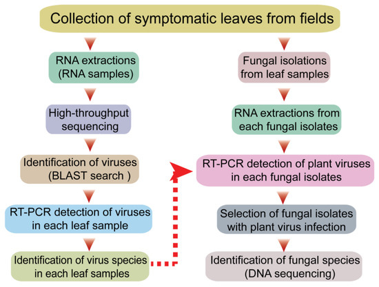 Schematic diagram illustrating the experimental procedures for the screening of fungal strains with plant virus infections.