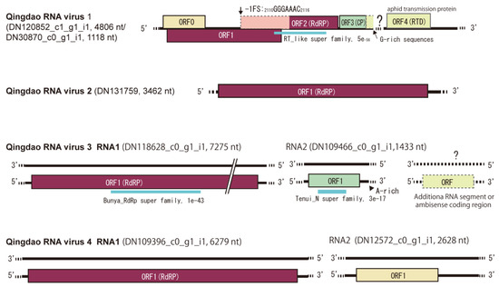 Four virus-related sequence contigs had low or moderate amino acid sequence identities (22–64%) to known viruses and, therefore, were provisionally identified as Qingdao RNA virus 1–4 (QRV1, QRV2, QRV3, and QRV4; Table 1). QRV1-encoded putative RNA-dependent RNA polymerase (RdRP) had a 67.3% identity to that encoded by the enamovirus grapevine enamovirus 1 (GEV-1, family Luteoviridae) [39,40]. QRV1 appears to have a monopartite (+)ssRNA genome similar to that of enamoviruses, but its sequence contig appeared to lack the 3′-terminal sequence region. During BLAST analyses, an additional short sequence contig (DN30870 _c0_g1_i1, 1118 nt), which is possibly the 3′-terminal region of the QRV1 genome that encodes a putative protein having a 53.4% identity to the coat protein (CP) readthrough domain (RTD) of an enamovirus (Accession No. YP_009249825.1) was also identified (Figure 3). Moreover, phylogenetic analysis based on RdRP (a putative P1-P2 fusion) sequence indicated close relatedness of QRV1 with enamoviruses (Figure 4); therefore, QRV1 is possibly a novel virus species in the genus Enamovirus. QRV2-encoded putative RdRP had a 48.3% identity with that of beihai narna-like virus 23, a monopartite narna-like virus [41]. The presence of a predicted single open reading frame (ORF) in its (+)ssRNA genome and phylogenetic relationship based on RdRP sequence (Figure 3 and Figure 4) further supports the view that QRV2 belongs to the narna-like virus group (a group of betanarnaviruses, sub-clade 1) [42]. QRV3 had a large ssRNA segment with negative-strand polarity and encoded a putative RdRP that had a 37.1% identity with that of apple rubbery wood virus 1 (ARWV-2), a rubodvirus with three (–)ssRNA segments belonging to the family Phenuiviridae [43,44]. A sequence contig, which is possibly a partial sequence of the additional segment of the QRV3 genome because it encoded a putative protein that had a 30.4% identity with a putative nucleocapsid protein of ARWV-2 (Accession No. QZW25191), was also identified (Figure 3). Phylogenetic analysis based on RdRP (L protein) sequence showed that QRV3 formed a clade with other rubodviruses (Figure 4), suggesting that QRV3 is a novel virus belonging to the genus Rubodvirus. QRV4 had a negative-strand genome (Figure 3), and its putative RdRP had a 22.2% identity with that of the yingvirus, Wuhan insect virus 15 (WhIV-15), a bipartite (–)ssRNA virus belonging to the family Qinviridae, which has divergent virus members that are usually identified in insects [41]. Moreover, identification of a sequence contig (DN12572_c0_g1_i1, 2628 nt), possibly a candidate for the second segment of QRV4, which encoded a putative protein having a 29.3% identity with a hypothetical protein of WhIV-15 (Accession No. YP_009342457) as well as its phylogenetic relatedness to members of Qinviridae based on RdRP sequence (Figure 3 and Figure 4) suggest that QRV4 is related to the yingvirus group.