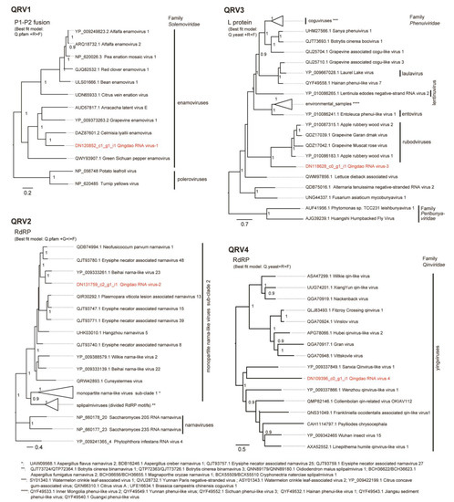 Phylogenetic relationships of QRV1, QRV2, QRV3, and QRV4 with their related viruses. The virus names are followed by their accession numbers. Poleroviruses, narnaviruses, and peribunyaviruses were used as outgroups in the tree for QRV1, QRV2, and QRV3, respectively. The trees were refined using FigTree ver. 1.3.1 and the scale bar represents amino acid distances. The numbers at the nodes indicate aLRT values determined using an SH-like calculation (>0.9 are displayed). Some phylogroups were collapsed into a triangle. The names and accession numbers of these viruses are shown below the trees.