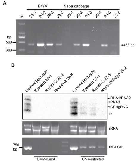 Detection of plant viruses in the fungal strains. (A) Nested RT-PCR detection of BrYV in the fungal strains isolated from the napa cabbage sample. (B) Detection of CMV in the fungal strains by RT-PCR and Northern blotting. * indicates undefined bands.