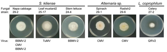 A total of 56 fungal strains carrying plant viruses were analyzed for species identification using DNA barcoding markers. Sequence analyses of ITS and/or TEF1α and BLAST searches against GenBank revealed that the fungal strains belong to three species groups (Supplementary File S3). According to ITS and TEF1α sequence identities by BLASTn search against ITS from fungi type and reference material (a RefSeq curated dataset) and nucleotide collection, respectively, the majority of the fungal strains (52 strains) were most likely to be Sarocladium kiliense (syn. Acremonium kiliense, order Hypocreales) (Supplementary File S4), while two strains were identified as Lecanicillium coprophilum (order Hypocreales; Supplementary File S5). Two other strains belong to the genus Alternaria (order Pleosporales, family Pleosporaceae), but their species classification was not clear (Supplementary File S6). S. kiliense was derived from all leaf samples and carried all 10 viruses detected. L. coprophilum was derived from the celery and radish-2 leaf samples and harbored QRV1 and BBWV-2, while Alternaria sp. was derived from the radish-2 and spinach leaf samples and harbored CMV (Supplementary File S2). Thus, it appears that S. kiliense is predominant among the fungal strains isolated, and there is no clear specificity between the plant viruses and their fungal hosts. Representative fungal colonies of S. kiliense, L. coprophilum, and Alternaria sp. cultured on PDA medium are presented in Figure 6.