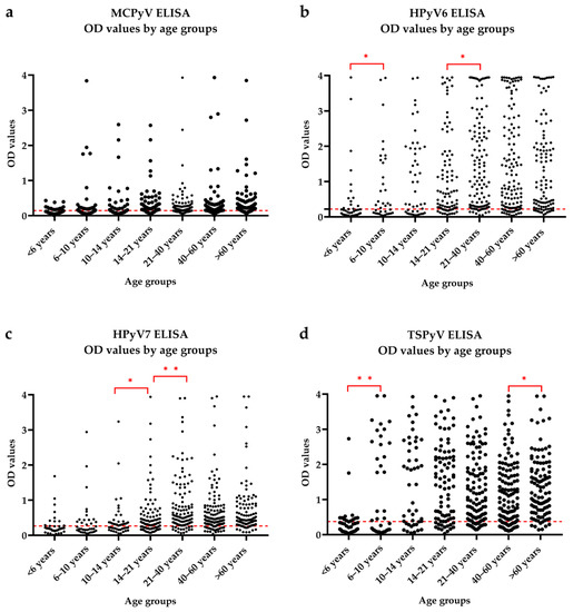 Age distribution of seroresponses against the major capsid proteins of MCPyV (a), HPyV6 (b), HPyV7 (c) and TSPyV (d). Each dot represents the optical density (OD) value of an individual serum sample measured with the enzyme-linked immunosorbent assay (ELISA). The cut-off values are shown by red dashed lines, which serve as thresholds for seropositivity. Significant differences in seroreactivity between age groups are presented with red lines and asterisks (Mann–Whitney test, * p ≤ 0.05, ** p ≤ 0.01).