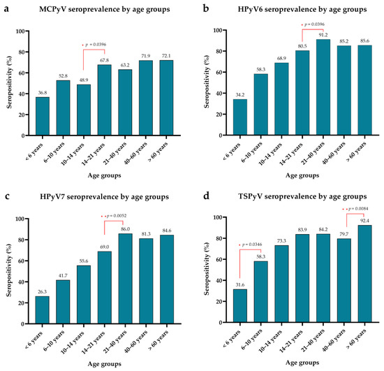 Age-specific seroprevalences of the studied polyomaviruses are shown in Figure 4. The seropositivity for all four polyomaviruses increased significantly with age (Χ2 test for trend; p = 0.0004 for MCPyV and p < 0.0001 for HPyV6, HPyV7 and TSPyV). This finding is consistent with published data [26,38,39,40]. Our data strengthen the findings that primary infection occurs in early childhood: the vast majority is possible in children and young adults, but it may happen throughout life. There was a significant increase in seroprevalence in different age groups for the studied polyomaviruses. For MCPyV (Figure 4a), there was a significant increase between 10–14 and 14–21 years; for HPyV6 (Figure 4b) and HPyV7 (Figure 4c), there was a significant increase between 14–21 and 21–40 years. The significant and highest increase in seropositivity for TSPyV was in the 6–10 years age group. These findings are in agreement with the results of seroreactivity analysis: the age groups with significantly higher seropositivity showed significantly higher OD values for HPyV6, HPyV7 and TSPyV (Figure 2b–d and Figure 4b–d). After reaching the adulthood level of seroprevalence in the 14–21 years age group (for MCPyV and TSPyV) or the 21–40 years age group (for HPyV6 and HPyV7), the antibody levels against the viruses remained relatively stable. There was a significant increase in seroprevalence in the oldest age group (>60 years) for TSPyV. Increased seropositivity in elderly patient groups has been observed by others [34,36]. This increase may be due to the fact that primary infection can occur at any time during life, resulting in increasing seroprevalence with age. However, similarly to the findings of Šroller et al. [36], the seroprevalence among the adults < 60 years in our study cohort was relatively stable, and then increased (Figure 4d). This phenomenon might be the consequence of reactivation of latent infection.