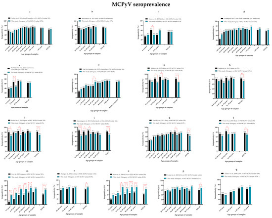 Pairwise comparison of age-specific MCPyV seroprevalence. Each panel represents a comparison between our results and one published study which are the followings: (a) [41], (b) [16], (c) [42], (d) [43], (e) [44], (f) [35] (g) [45], (h) [40], (i) [46], (j) [38], (k) [47], (l) [48], (m) [49], (n) [50] (o) [51], (p) [52] and (q) [39]. Significant differences between age groups are indicated by red lines and asterisks (Fisher’s exact test, * p ≤ 0.05, ** p ≤ 0.01, *** p ≤ 0.001, **** p ≤ 0.0001).