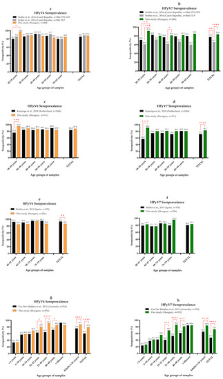 Pairwise comparison of age-specific HPyV6 and HPyV7 seroprevalence. Each panel represents a comparison between our results and one published study which are the the followings: (a,b) [36], (c,d) [38], (e,f) [40] and (g,h) [35]. Significant differences between age groups are indicated by red lines and asterisks (Fisher’s exact test, * p ≤ 0.05, ** p ≤ 0.01, *** p ≤ 0.001, **** p ≤ 0.0001).