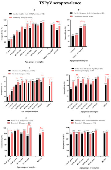 Pairwise comparison of age-specific TSPyV seroprevalence. Each panel represents a comparison between our results and one published study which are the followings: (a) [35], (b) [53], (c) [54], (d) [36], (e) [40] and (f) [38]. Significant differences between age groups are indicated by red lines and asterisks (Fisher’s exact test, * p ≤ 0.05, ** p ≤ 0.01, **** p ≤ 0.0001).