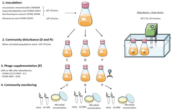 The four bacterial and yeast strains were separately grown overnight in MRS broth at 30 °C as pre-cultures. Then, 600 mL of fresh MRS broth adjusted to pH 5.5 was simultaneously inoculated at 101 CFU/mL with each of the three strains L. mali UCMA 16447, Ln. mesenteroides CIM 3004, and S. uvarum UCMA 10446, and at 103 CFU/mL with O. oeni UCMA 19297 strain, and incubated at 25 °C. After 24 h of incubation (when strains reached ~105 CFU/mL), the 600 mL of co-culture was divided into three aliquots of 200 mL each. The first aliquot was used as control (C), while the two others (D and P) were subjected to a heat shock of 50 °C for 10 min, in order to create a disturbance of the microbial equilibria. The objective was to disturb the microbial equilibria without eliminating a microbial strain of the model. After the heat shock, the aliquots were immediately and rapidly cooled down to 25 °C, and incubation continued. Twenty-four hours after disturbance, phage UCMA 21115 and phage PLE001 were introduced at a MOI of 0.1 and of 0.01, respectively, into aliquot P only, in order to mimic the low abundance of phages in cider [26]. Preliminary tests of different MOIs were performed to determine the most suitable MOI to be used in this experiment (data not shown). Samples were taken from C, D and P every 24 h from inoculation, for at least 5 days, for pH measurements (Mettler Toledo, Colombus, OH, USA) and microbial and phage enumerations, and the HPLC and GC-MS analysis, as described below.