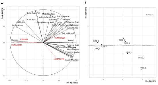 In the same way, PCA was displayed at 168 h where Dim 1 and Dim 2 accounted for 84.37% of the total variance (54.69% and 29.68% for Dim 1 and Dim 2, respectively) (Figure 3).