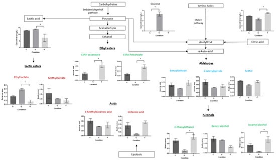 Principal compounds and hypothetical representation of the metabolic pathways potentially involved in the production/consumption of these compounds at 25 °C between conditions C, D and P at 168 h. Green compounds were principally associated to yeast activity, red compounds to LAB activity and blue compounds to yeast and/or LAB activity. Concentrations of lactic acid and citric acid were determined by HPLC and expressed in g/L. The volatile compounds were analyzed by GC-MS and expressed with relative area (standardized with internal standards). A Kruskal–Wallis test was performed for each compound, and multiple comparisons were performed using Dunn’s procedure. A p-value of ≤ 0.05 was considered significant (*).