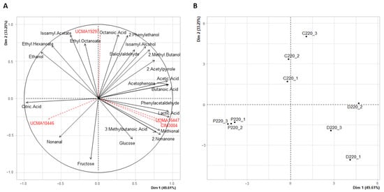 At 15 °C, PCA was also displayed using time points from T0 to T220 h (Figure S4). As at 25 °C, the samples were distributed according to time rather than condition (C, D or P). The first sampling times (0, 96 h and 144 h) were associated to high concentrations of sugars (glucose, fructose) and citric acid, and the last sampling time (220 h) was associated to VOCs in high abundance. For this time point, little differences between replicates from the three conditions were observed (Figure S4). A PCA was performed at the last time point (220 h), where Dim 1 and Dim 2 represented 82.86% of the total variance (49.61% and 33.25% for Dim 1 and Dim 2, respectively) (Figure 5).