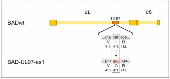 Construction of BAD-UL97-as1. The triplet cat coding for histidin on position 411 within the UL97 gene was replaced by ggg coding for glycin using the BAC recombination technique described in [].
