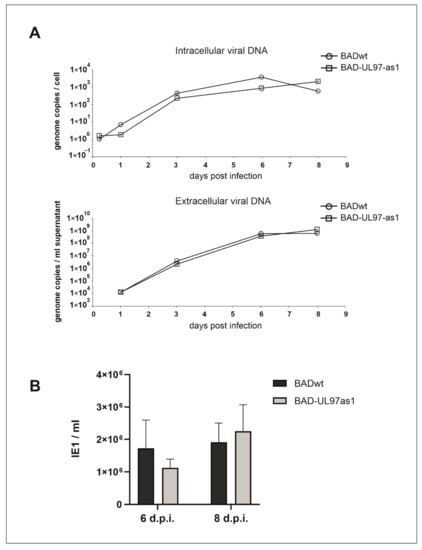 Virus titers were determined by quantitation of viral genomes in cell culture by quantitative PCR as described in []. The main aspects and the modifications are briefly described in the following sentences. The genome copies were estimated in infected cells as follows: 0.5 × 106 cells were seeded in 10 cm dishes. On the next day, cells were infected with Ad169/BAD-wt or BAD-UL97-as1, using different virus dilutions (10 µL, 50 µL, 100 µL und 500 µL). After 6 h post-infection, the cells were harvested, adjusted to 1 × 106/mL in PBS and analyzed by quantitative PCR, using an ABI 7500 Fast real-time PCR detection system. Analysis of intracellular viral DNA replication and extracellular viral DNA were performed by quantitative PCR analysis, as previously described []. For this, 0.5 × 106 cells were seeded in 10 cm dishes and infected with 4 genomes/cell on the next day. On different days post-infection, both supernatant and cells were harvested. The supernatant was transferred into a 50 mL reaction tube, centrifuged at 2800 rpm for 10 min and stored in 1 mL aliquots at −80 °C. At 6 h post-infection and different days post-infection, the cells were washed with 1× DPBS, harvested by 1× trypsin/EDTA, centrifuged, counted and adjusted to 1 × 106/mL with 1× DPBS and stored at −20 °C. The DNA was isolated both from 200 µL supernatant and 1 × 105 cells by using the High Pure viral nucleic acid kit (Roche Holding AG, 11858874001) according to the manufacturer’s instructions. The quantification was performed by qPCR.