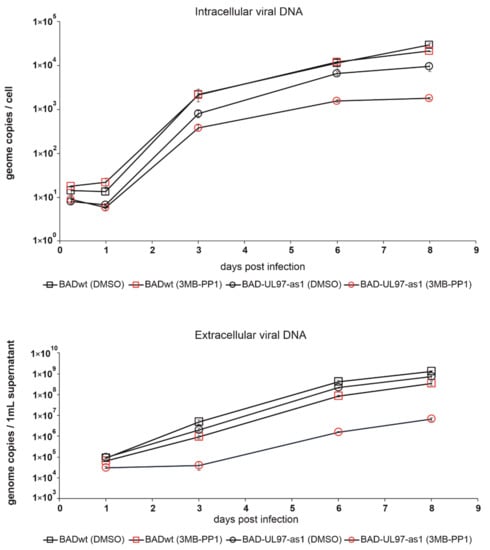 For experiments under impaired or blocked kinase activity, we used reasonably high doses of 3MB-PP1 (40 µM), hoping to sufficiently block the kinase activity of BAD-UL97-as1. While the literature suggests lower doses of 3MB-PP1 to be sufficient, we found the best reduction in the phosphorylation of the pUL97 substrate Rb using 40 µM of 3MB-PP1 (Supplementary Figure S3). Upon infection with BAD-UL97-as1, 3MB-PP1 reduced the amounts of intracellular as well as extracellular viral DNA over a time course of 8 days, while having only little effect on titers of the parental strain BADwt. This was not surprising, because a loss of the kinase activity of pUL97 has been described previously as non-beneficial for viral replication [,].