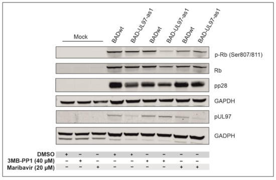 The cellular retinoblastoma protein (Rb) is a confirmed target of pUL97. pUL97 phosphorylates Rb on Serines 807 and 811 [,]. In the next step, we monitored the phosphorylation status of Rb in cells infected with either BADwt or the BAD-UL97-as1 mutant, using a specific antibody for these residues (Figure 4). Cells were treated with 40 µM 3MB-PP1 or with DMSO the day before infection and samples were collected at 5 days post-infection (d.p.i.). As a positive control, we also treated cells with 20 µM of a known inhibitor of pUL97, maribavir (MBV), LivtencityTM [] and analyzed the samples using SDS-PAGE and Western blot. Uninfected (mock) cells were also treated as control.